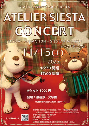 バイオリンとアコーディオンのデュオ「SIESTA」がオリジナル音楽とオリジナルキャラクター人形を使って作る